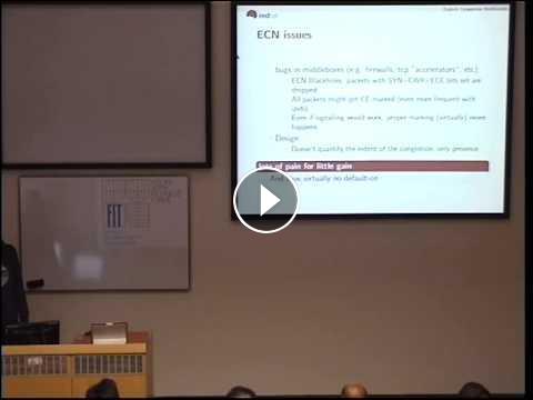This talk presents the recently added TCP congestion control algorithm to the Linux kernel, namely Data Center TCP (DCTCP), and gives a general overview of problems it solves inside data centers as well as its inner workings.