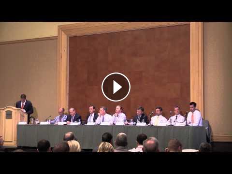 Clayton Funk of MVP moderates a panel focused on the state of the capital markets, the business impact of 4G, merger and acquisition activity, international opportunities and more during PCIA's 2015 Wireless Infrastructure Show in Hollywood, Fla. Panelists include Ron Bizik, CEO of Tarpon Towers, Crown Castle SVP Jay Brown, Kevin Brynestad of Alpina Capital, SBA SVP Brendan Cavanagh and others. MVI 1542