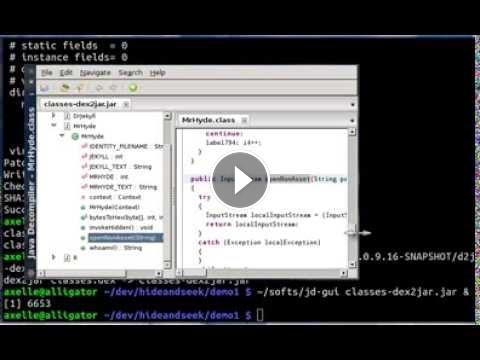* Then the method is hidden using a script hidex.pl (hide.sh helper script) and the demo shows that dissassemblers don't see it : Androguard, procyon, baksmali, jd-gui...