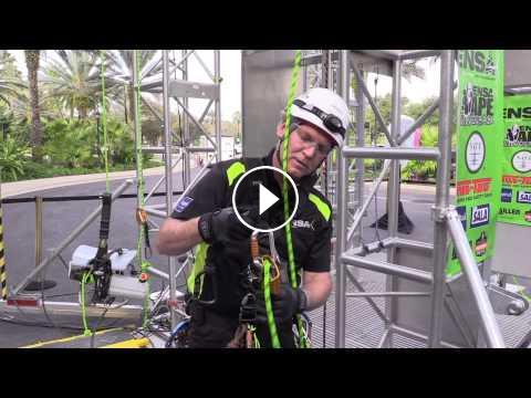 Glen Bedgood of ENSA North America explains how the mobile fall arrester on his rope access harness works at NATE UNITE 2015.