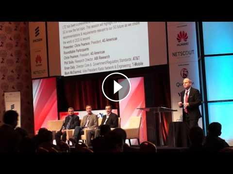 Chris Pearson, president of 4G Americas, leads a discussion with telecom analyst Phil Solis, Mark McDiarmid, VP of Radio Network Engineering and Development for T-Mobile US (seated center), and Brian Daly, Director for Core and Government/Regulatory Standards at (seated left)AT&T about various aspects of 5G as part of the LTE North America conference. Part 1 of 2.