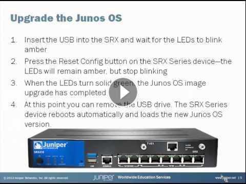 The Branch SRX Series -- USB Autoinstall feature allows you to upgrade the Junos OS image with minimal configuration effort and without the need for console port access. The task is performed by simply inserting a USB flash drive containing the Junos OS image into a USB port of a Branch SRX Series device and performing a few simple steps.