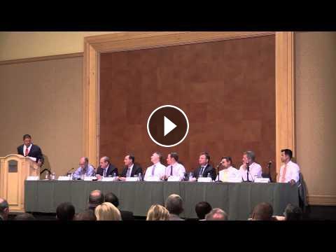 Clayton Funk of MVP moderates a panel focused on the state of the capital markets, the business impact of 4G, merger and acquisition activity, international opportunities and more during PCIA's 2015 Wireless Infrastructure Show in Hollywood, Fla. Panelists include Ron Bizik, CEO of Tarpon Towers, Crown Castle SVP Jay Brown, Kevin Brynestad of Alpina Capital, SBA SVP Brendan Cavanagh and others. MVI 1541