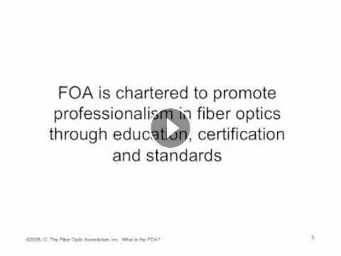 What is the FOA? The FOA is the international non-profit professional society of fiber optics, chartered to promote the fiber optics industry through education, certification and standards. In this video, FOA President Jim Hayes presents an overview of the organization and its work.