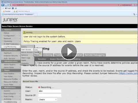 Policy Tracing allows you to troubleshoot issues by tracking events when a user signs in and access resources using the Junos Pulse Secure Access Service. Policy Tracing is used simultaneously while a user is signing in and attempting to access secured resources. This learning byte demonstrates how Policy Tracing is used to troubleshoot authentication and authorization issues.
