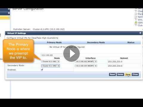 This video will teach you how to set up Virtual IP interfaces on two ClearPass Policy Managers in a cluster. This allows you to have a secondary RADIUS, TACACS+, WebAuth and captive portal options in the event one of the appliances is off-line.